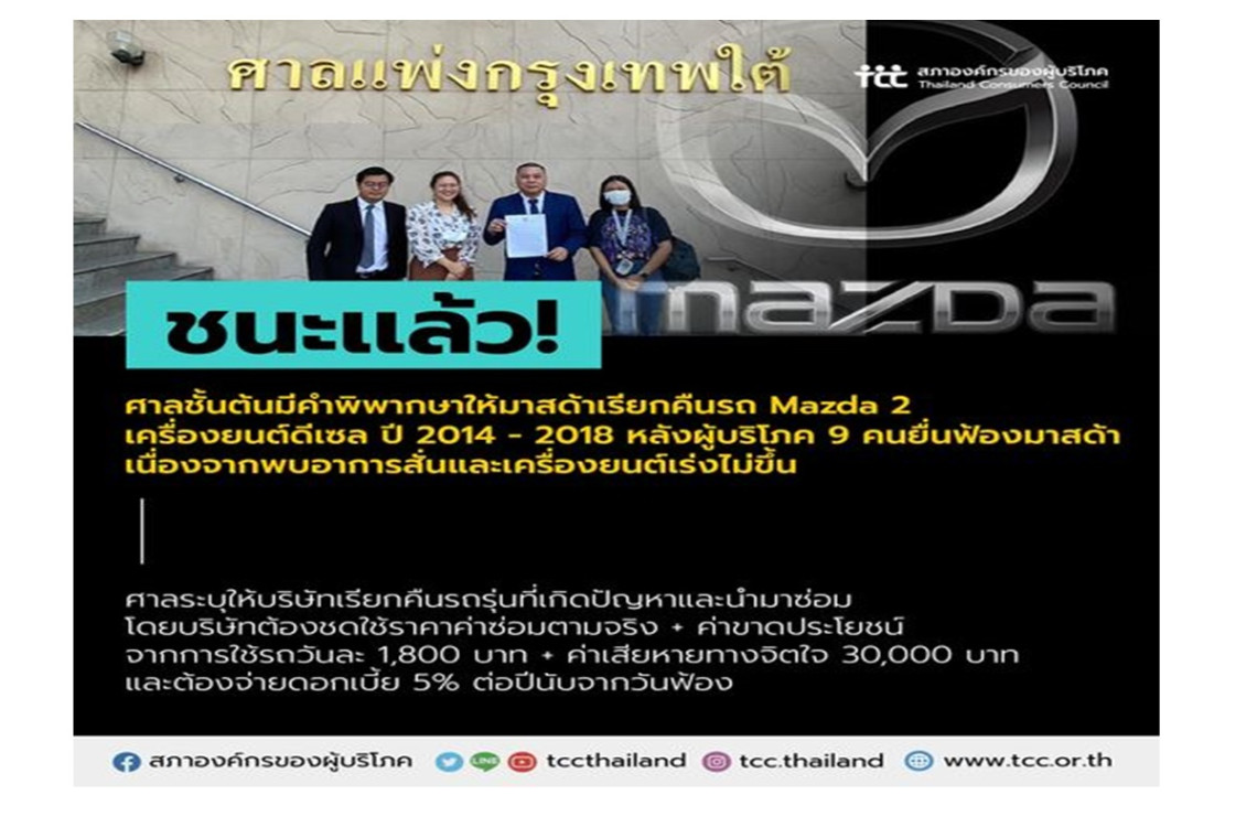 เพจสภาองค์กรของผู้บริโภค โพสต์ระบุข้อความว่า ศาลชั้นต้นมีคำพิพากษาให้มาสด้าเรียกคืนรถ Mazda 2 เครื่องยนต์ดีเซล ปี 2014 - 2018 ทุกคัน หลังผู้บริโภค 9 คนยื่นฟ้องมาสด้า เนื่องจากพบปัญหาเรื่องการใช้งาน ไม่ว่าจะเป็นเครื่องสั่น หรือเครื่องยนต์เร่งไม่ขึ้น ศาลระบุให้บริษัทเรียกคืนรถรุ่นที่เกิดปัญหาและนำมาซ่อม โดยบริษัทต้องชดใช้ราคาค่าซ่อมตามจริง + ค่าขาดประโยชน์จากการใช้รถวันละ 1,800 บาท + ค่าเสียหายทางจิตใจ 30,000 บาท และบริษัทต้องจ่ายดอกเบี้ย 5% ต่อปีนับจากวันฟ้อง