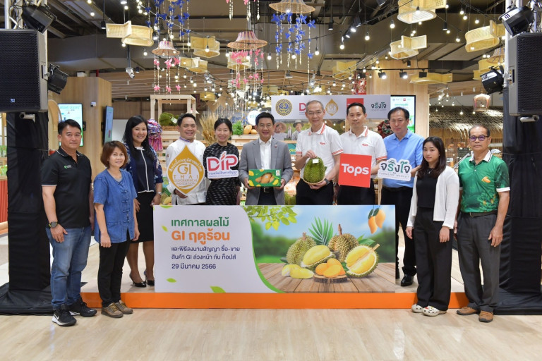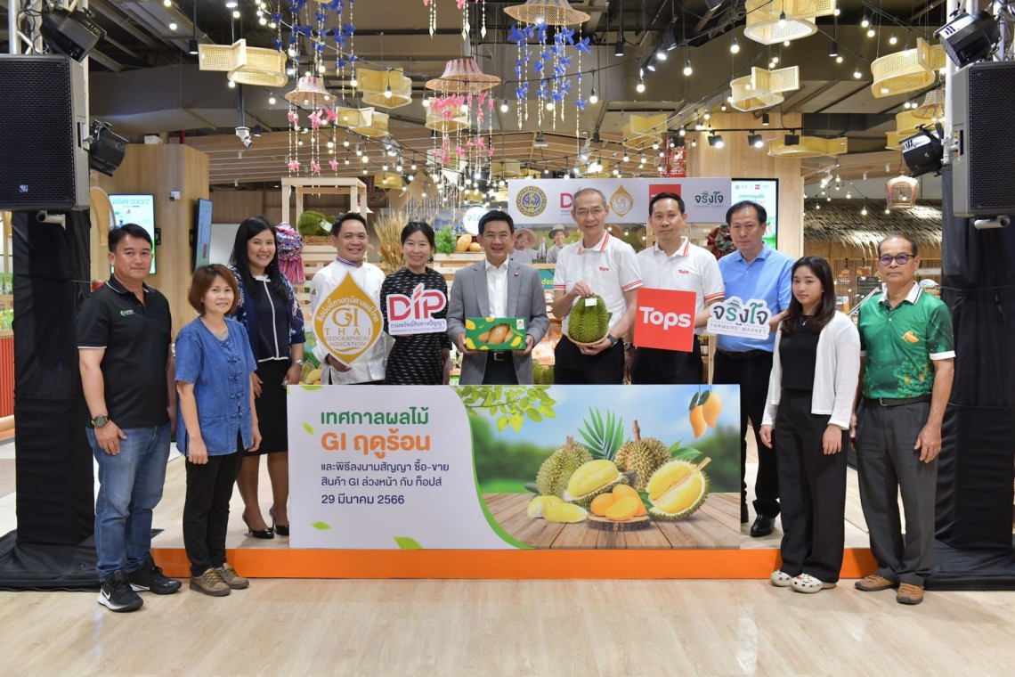 กรมทรัพย์สินทางปัญญาผนึกกำลังท็อปส์ ขยายช่องทางตลาดสนับสนุนเกษตรกรผู้ประกอบการ GI จัดงานเทศกาลผลไม้ GI ฤดูร้อน ยกขบวนสินค้า GI ถึง 40 รายการ มาจำหน่าย ณ ตลาดจริงใจ Farmers' Market ศูนย์การค้าเซ็นทรัลเวิลด์ โดยดึงเชฟชุมพล เชฟระดับมิชลินร่วมสาธิตการทำอาหารโดยมีสินค้า GI เป็นวัตถุดิบ พร้อมเซ็นสัญญาซื้อ–ขายสินค้า GI กับผู้บริหารเซ็นทรัล เตรียมส่งทุเรียนและมะม่วง GI กว่า 65,000 กิโลกรัม ตรงถึงตลาดจริงใจในเครือเซ็นทรัลทั่วประเทศ