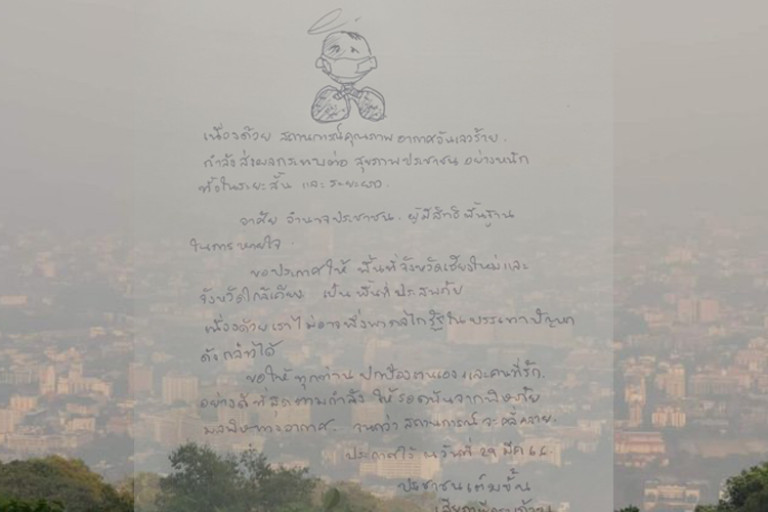 โดยข้อความในกระดาษที่เขียนด้วยลายมือระบุว่า " เนื่องด้วยสถานการณ์คุณภาพอากาศอันเลวร้ายกำลังผลกระทบต่อสุขภาพประชาชนอย่างหนักทั้งในระยะสั้นและระยะยาว อาศัยอำนาจประชาชนผู้มีสิทธิ์พื้นฐานในการหายใจ ขอประกาศให้พื้นที่จังหวัดเชียงใหม่และจังหวัดใกล้เคียงเป็นพื้นที่ประสบภัยเนื่องด้วยเราไม่อาจพึ่งพากลไกรัฐในการบรรเทาปัญหาดังกล่าวได้ ขอให้ทุกท่านปกป้องตนเองและคนที่รักอย่างดีที่สุดตามกำลัง ให้รอดพ้นจากพิษภัยมลพิษทางอากาศ จนกว่าสถานการณ์จะคลี่คลาย ประกาศไว้ณวันที่ 29 มี.ค.66" และลงชื่อ"ประชาชนเต็มขั้น เสียภาษีครบถ้วน"