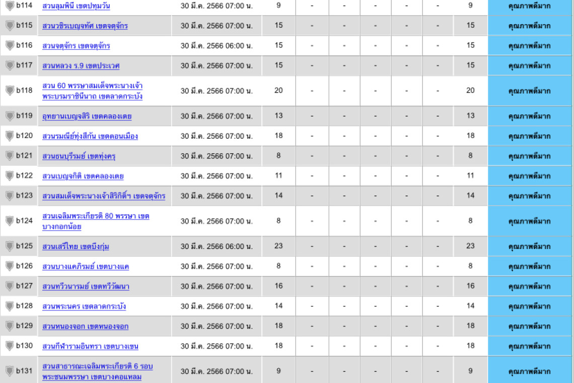 วันที่ 30 มีนาคม 2566 ระหว่างเวลา 05.00-07.00 น. กองจัดการคุณภาพอากาศและเสียง กรมควบคุมมลพิษรายงานสถานการณ์คุณภาพอากาศ พื้นที่กรุงเทพฯ พบว่า คุณภาพอากาศอยู่ในระดับ คุณภาพดีมาก ถึง คุณภาพดีโดยมีค่าฝุ่น PM2.5 อยู่ระหว่าง 8-26 มคก./ลบ.ม.