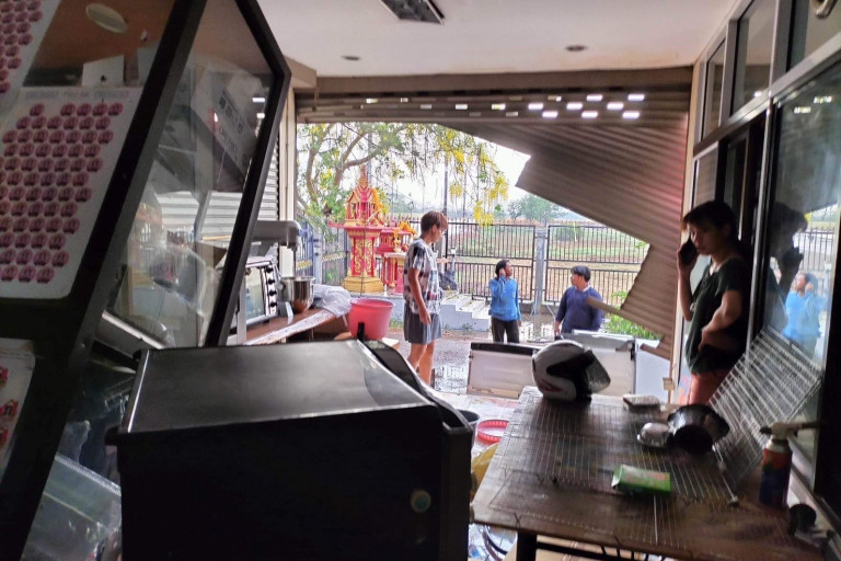 จากการสอบถามนายรัทธ์เกียรติ ถาวรวัฒนยงค์ อายุ 55 ปี เจ้าของร้าน ที่เกิดเหตุพายุฤดูร้อนถล่มในครั้งนี้ ได้เล่าให้ฟังว่า เมื่อเวลาประมาณ 17.10น ตน และลูกน้องกำลังปิดร้าน ได้เกิดฝนตกลงมาก่อน แล้วเกิดลมพายุฤดูร้อนกรรโชกแรงซัดเข้าทางประตูหน้าร้าน จนทำให้ประตูเหล็กด้านหน้าของร้านค้าเปิดออก พายุฤดูร้อนได้หอบเอาทั้งลมและฝนซัดเข้ามาภัยในร้าน ทำให้ทั้งตู้เย็น ตู้โชว์ของร้านเสียหายกระจกแตกจำนวนมาก มีสิ่งของภายในร้านเสียหายมูลค่าประมาณ 100,000กว่าบาท