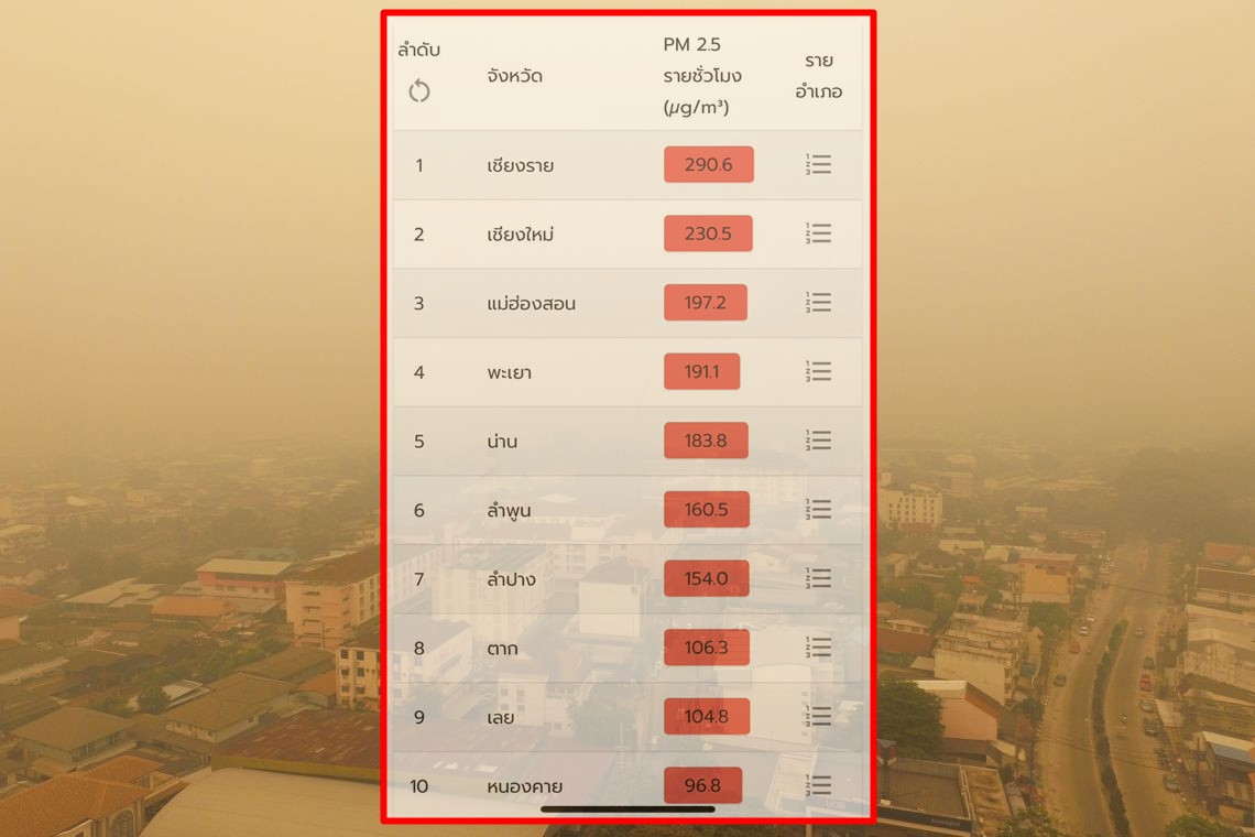 ค่าฝุ่น PM2.5 วันนี้ทางภาคเหนือคงน่าเป็นห่วงมากเช่นเคย เมื่อตรวจสอบจากแอปพลิเคชัน “เช็คฝุ่น” แบบรายชั่วโมง เมื่อเวลา 10.00 น. ที่ผ่านมาพบหลายจังหวัดมีค่า PM2.5 อยู่ในระดับสีแดง และมีผลกระทบต่อสุขภาพ โดยเฉพาะที่จังหวัด #เชียงราย #เชียงใหม่ ที่มีค่า PM 2.5 สูงสุดกว่า 200 ไมโครกรัม ตามด้วย #แม่ฮ่องสอน #พะเยา #น่าน #ลำพูน #ลำปาง #ตาก #เลย #หนองคาย ประชาชนควรสวมหน้ากากอนามัย และงดกิจกรรมภายนอกอาคารสถานที่เพื่อป้องกันโรคระบบทางเดินหายใจที่จะตามมา ในขณะที่กรุงเทพมหานคร พบค่าคุณภาพอากาศส่วนใหญ่อยู่ในระดับดี