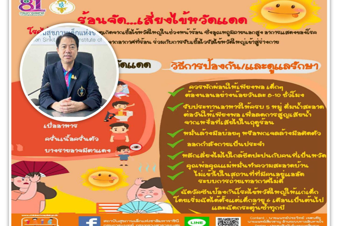 นพ.อัครฐาน จิตนุยานนท์ ผู้อำนวยการสถาบันสุขภาพเด็กแห่งชาติมหาราชินี กรมการแพทย์ กล่าวว่า ในช่วงฤดูร้อนของประเทศไทยที่มีอุณหภูมิสูงขึ้นและอากาศร้อนอย่างต่อเนื่อง อีกทั้งเป็นช่วงที่เด็ก ๆ ปิดเทอม โดยเฉพาะเทศกาลสงกรานต์ที่มีวันหยุดต่อเนื่องหลายวัน ส่วนใหญ่ต่างพากันเดินทางท่องเที่ยวตามสถานที่ต่างๆ ซึ่งหลีกเลี่ยงไม่พ้นจากการเจอแสงแดด อากาศร้อน และการรับประทานอาหารที่ไม่สะอาด ปัจจัยเหล่านี้ทำให้เกิดโรคต่างๆ ได้มากมาย ซึ่งเด็กๆมีภูมิต้านทานไม่มากนักจึงมักเจ็บป่วยได้ง่าย ผู้ปกครองจึงควรใส่ใจสุขภาพของบุตรหลาน หมั่นสังเกตอาการเจ็บป่วยที่เกิดขึ้น และหากพบความผิดปกติควรไปพบแพทย์เพื่อได้รับการรักษาอย่างถูกต้อง