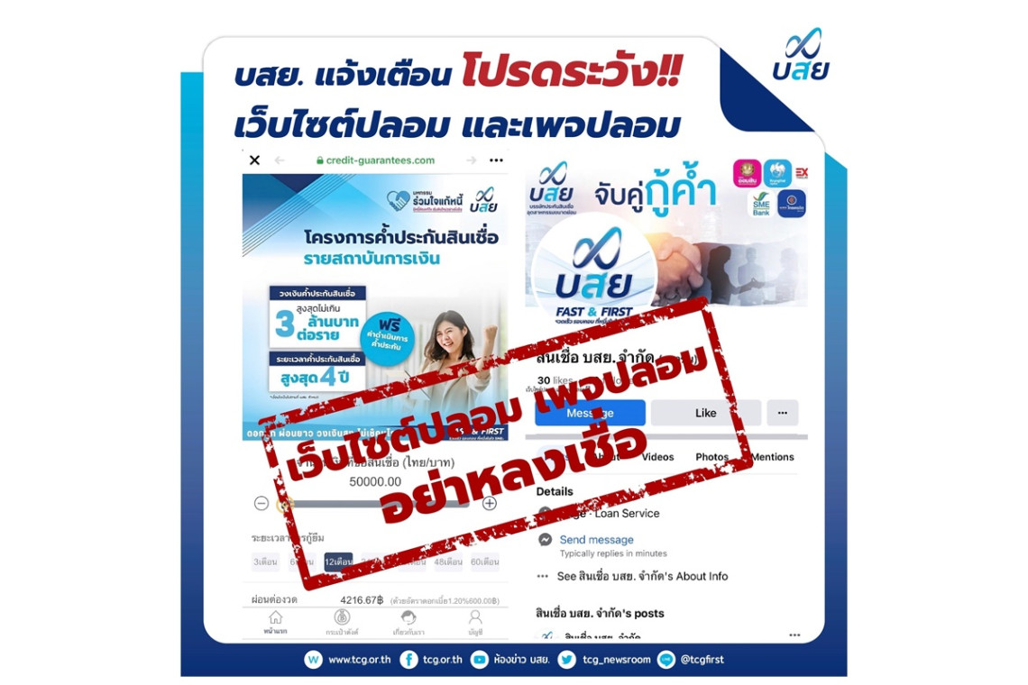 บสย.จึงขอแจ้งเตือน เพื่อป้องกันภัยจากกลุ่มมิจฉาชีพที่อาจก่อให้เกิดความเสียหายแก่ประชาชน ผู้ประกอบการ SMEs ว่าบสย. เป็นหน่วยงานรัฐวิสาหกิจ อยู่ภายใต้การกำกับของกระทรวงการคลัง มีบทบาทหน้าที่ในการให้ความช่วยเหลือผู้ประกอบการ SMEs เฉพาะ “การค้ำประกันสินเชื่อ” เท่านั้น โดยไม่มีนโยบายและภารกิจให้กู้ยืมเงินในทุกๆช่องทาง