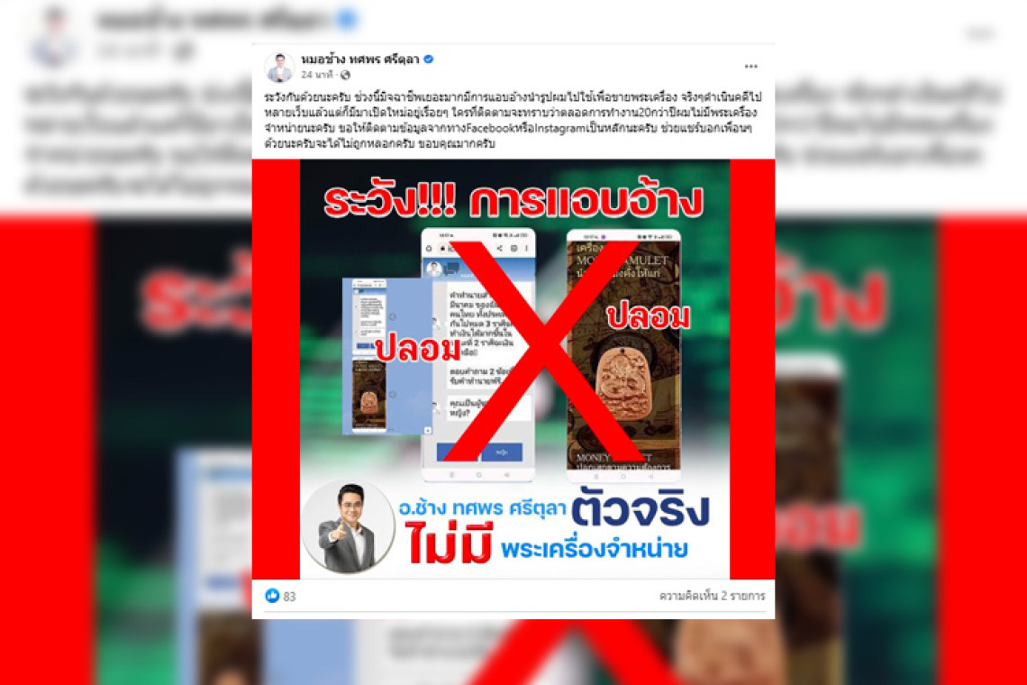 วันที่ 5 เม.ย.66 "หมอช้าง" ทศพร ศรีตุลา นักพยากรณ์ชื่อดังของประเทศไทย โพสต์ข้อความผ่านเฟซบุ๊ก หมอช้าง ทศพร ศรีตุลา เพื่อเตือนประชาชน ระวังการแอบอ้างจำหน่ายพระ โดยมีเนื้อความระบุว่า...ระวังกันด้วยนะครับ ช่วงนี้มิจฉาชีพเยอะมากมีการแอบอ้างนำรูปผมไปใช้เพื่อขายพระเครื่อง จริงๆดำเนินคดีไปหลายเว็บแล้วแต่ก็มีมาเปิดใหม่อยู่เรื่อยๆ ใครที่ติดตามจะทราบว่าตลอดการทำงาน20กว่าปีผมไม่มีพระเครื่องจำหน่ายนะครับ ขอให้ติดตามข้อมูลจากทางFacebookหรือInstagramเป็นหลักนะครับ ช่วยแชร์บอกเพื่อนๆด้วยนะครับจะได้ไม่ถูกหลอกครับ ขอบคุณมากครับ