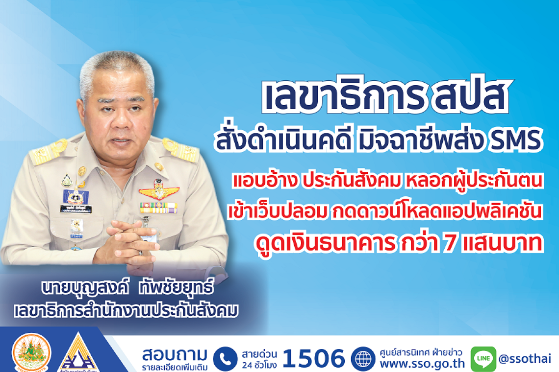 เลขาธิการ สปส. สั่งดำเนินคดี มิจฉาชีพส่ง SMS แอบอ้างประกันสังคม หลอกผู้ประกันตนเข้าเว็บปลอม กดดาวน์โหลดแอปพลิเคชัน ดูดเงินธนาคารกว่า 7 แสนบาท