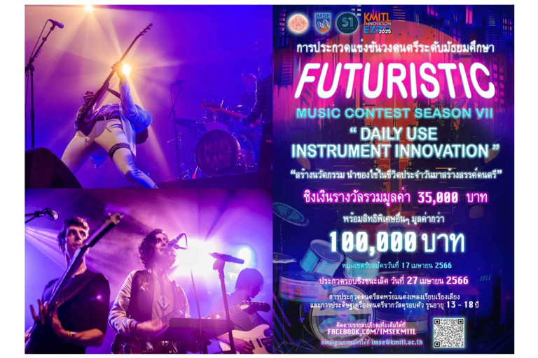 สถาบันเทคโนโลยีพระจอมเกล้าเจ้าคุณทหารลาดกระบัง (สจล.) โดย วิทยาลัยวิศวกรรมสังคีต เปิดเวทีสร้างไอดอลนักดนตรี...คนรุ่นใหม่สู่อุตสาหกรรมดนตรีและโลกบันเทิง จัดการประกวดแข่งขันวงดนตรี “Futuristic Music Contest : Season 7” รอบชิงชนะเลิศ วันที่ 27 เมษายน 2566 ในงาน KMITL Innovation Expo 2023 ณ หอประชุมคณะวิศวกรรมศาสตร์ สถาบันเทคโนโลยีพระจอมเกล้าเจ้าคุณทหารลาดกระบัง (สจล.) ถ.ฉลองกรุง เปิดรับสมัครวันนี้ - 17 เมษายน 2566