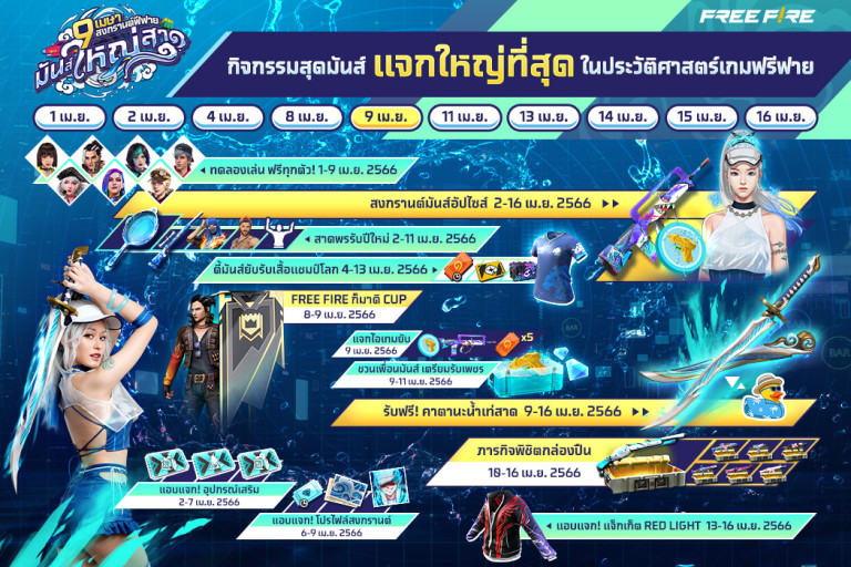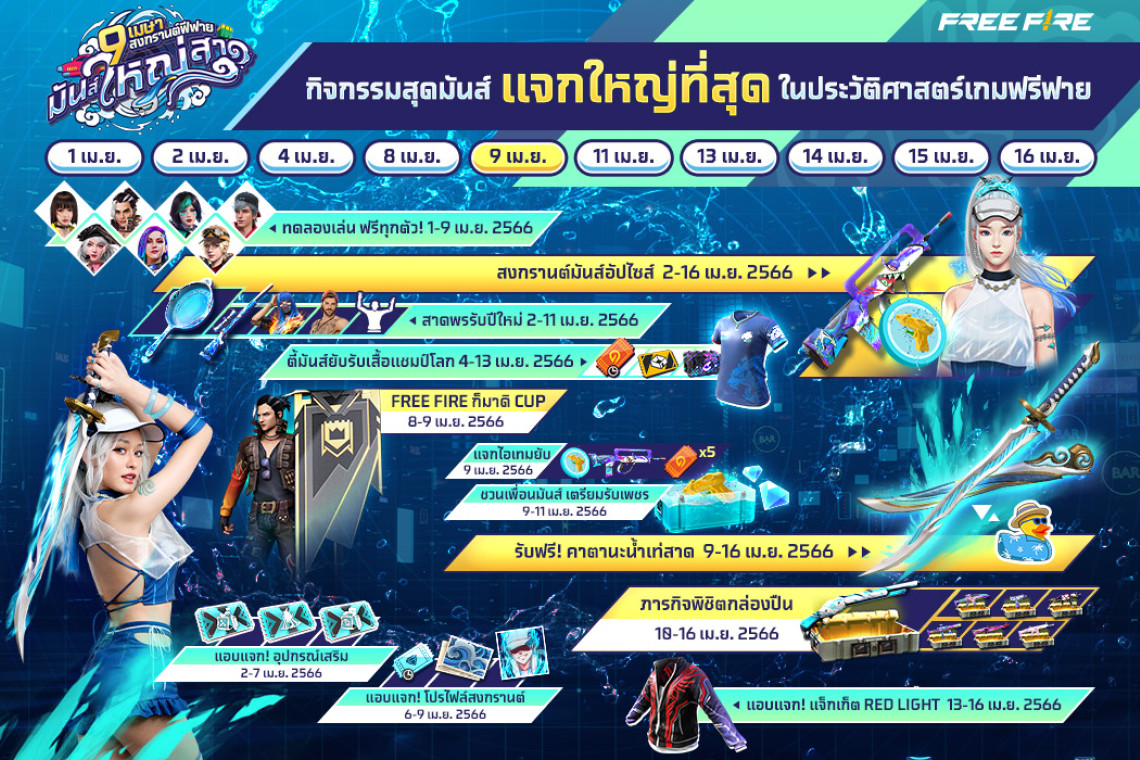 ไฮไลต์สุดท้ายต้อนรับเดือนเมษายน ชวนทุกคนหนีร้อน มาเข้าสาดความสนุกกันบนเกม พร้อมขนไอเทม แจกฟรี แจกหนักที่สุดในประวัติศาสตร์เกม Free Fire ทั้งดาบคาตานะใหม่ ชุดแฟชั่นสงกรานต์มันส์อัปไซส์ ท่าปักธงแคลนแบบใหม่ และไอเทมอีกมากมาย อย่าลืมเข้าเกมวันที่ 9 เมษายน 2566 นี้ และรับของฟรีอื่นๆ ตลอดช่วงสงกรานต์ ห้ามพลาดเด็ดขาด!