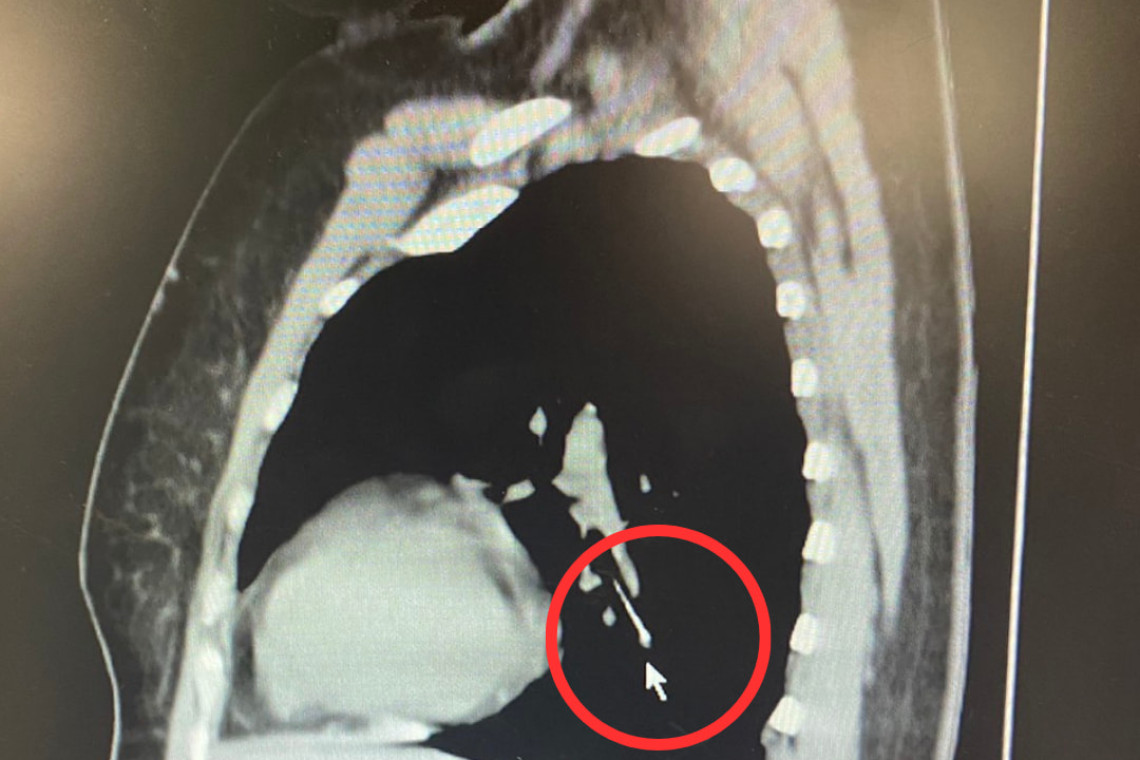 ผู้ป่วยหญิงอายุ 49 ปี ขณะเย็บผ้า ได้คาบเข็มหมุดไว้ในปาก ต่อมามีอาการสำลักเข็มหมุดหลุดลงคอ จึงได้มาตรวจที่ โรงพยาบาลนครพิงค์ ทำการตรวจเอ็กซเรย์คอมพิวเตอร์ พบว่าเข็มหมุดหลุดลงไปคาอยู่ในหลอดลมปอดข้างซ้าย