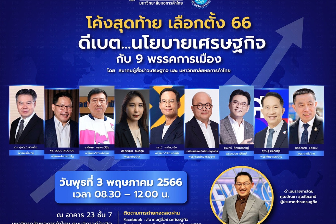 สมาคมผู้สื่อข่าวเศรษฐกิจ จับมือมหาวิทยาลัยหอการค้าไทย จัดซูเปอร์ดีเบต "โค้งสุดท้ายเลือกตั้ง 66 เจาะลึก...นโยบายเศรษฐกิจ 9 พรรคการเมือง” พร้อม MOU ความร่วมมือ อันเป็นประโยชน์ต่อวิชาชีพสื่อมวลชน