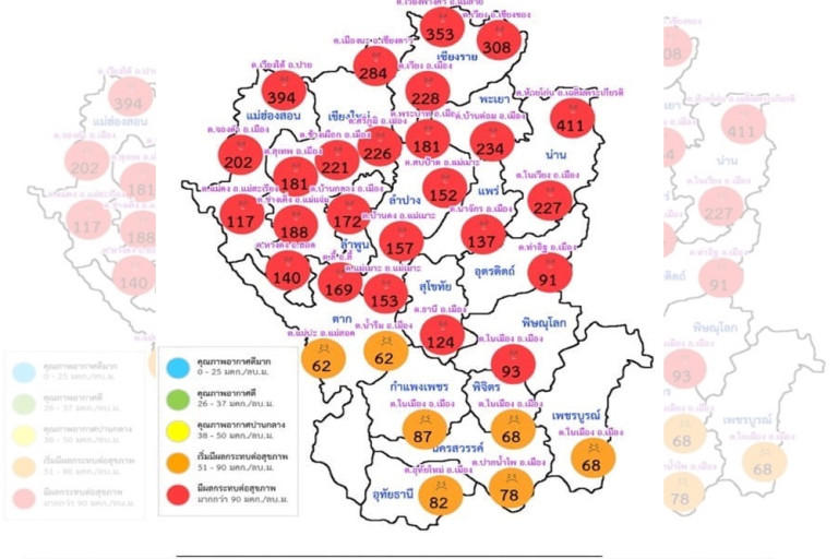 >>สำหรับประชาชนที่อยู่บริเวณพื้นที่มีผลกระทบต่อสุขภาพ (พื้นที่สีแดง) ควรหลีกเลี่ยงกิจกรรมกลางแจ้ง หรือใช้อุปกรณ์ป้องกันตนเอง หากมีอาการทางสุขภาพควรปรึกษาแพทย์
