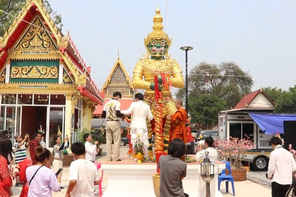ที่วัดดงปอ ต.ด่านช้าง อ.ด่านช้าง จ.สุพรรณบุรี พระครูสังฆรักษ์ วสันติ ฐานธมฺโม เจ้าอาวาสวัดดงปอ จัดพิธีบวงสรวงท้าวเวสสุวรรณคู่ ชื่อท้าวรุ่งเรือง สีแดง และ ท้าวร่ำรวย สีเขียว มีความสูง 5.9เมตร ฐานสูง1.20 เมตร กว้าง 2.50 เมตร โดยมีประชาชนเข้าร่วมพิธีบวงสรวงเป็นจำนวนมาก นอกจากนี้ยังมีดาราขื่อดังอย่าง “นุ่น สุทธิภา คงแนวดี” มาร่วมพิธีบวงสรวง เพื่อความเป็นสิริมงคล โดยในพิธีบวงสรวงจัดโต๊ะเครื่องบวงสรวงขนาดใหญ่ ประกอบด้วย หัวหมู เป็ด ไก่ อาหาร คาว หวาน เครื่องดื่ม ผลไม้มงคล จำนวนมาก