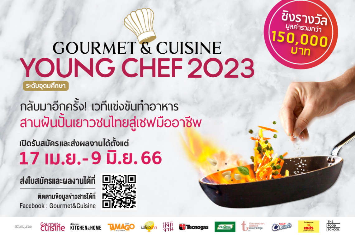 นิตยสาร Gourmet & Cuisine ร่วมกับ “The Food School Bangkok” โรงเรียนสอนทำอาหารชั้นนำระดับโลกเพื่อมุ่งสู่เชฟมืออาชีพโดยเฉพาะ ขอเชิญชวนนิสิต นักศึกษา ผู้ที่มีใจรักในการทำอาหาร ลงสนามแข่งขันทำอาหารระดับอุดมศึกษา “Gourmet & Cuisine Young Chef 2023” เพื่อสานฝันเยาวชนรุ่นใหม่สู่เชฟมืออาชีพมาประดับวงการอาหารเมืองไทย ร่วมชิงรางวัลมูลค่ารวมกว่า 150,000 บาท พร้อมถ้วยรางวัลเกียรติยศ ประกาศนียบัตรและรางวัลอื่นๆ อีกมากมาย