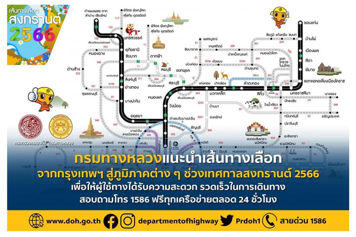 ทั้งนี้ กรมทางหลวงพร้อมดูแลด้านความสะดวกปลอดภัยการเดินทางของประชาชนอย่างเต็มที่ พร้อมขอความร่วมมือผู้ใช้ทางขับขี่ด้วยความระมัดระวัง ปฏิบัติตามกฎจราจร วางแผนการเดินทางล่วงหน้า เตรียมร่างกายให้พร้อม หากประชาชนต้องการสอบถามข้อมูลการเดินทางเพิ่มเติมหรือขอความช่วยเหลือระหว่างการเดินทางสามารถติดต่อได้ที่สายด่วนกรมทางหลวง 1586 สายด่วนมอเตอร์เวย์ 1586 กด 7 (โทรฟรีทุกเครือข่ายตลอด 24 ชั่วโมง) และตำรวจทางหลวง 1193