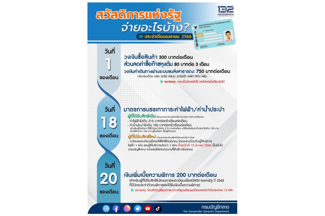 โครงการลงทะเบียนเพื่อสวัสดิการแห่งรัฐปี 2565 ผู้ที่ได้รับสิทธิจะใช้สิทธิสวัสดิการแห่งรัฐผ่านบัตรประจำตัวประชาชนแบบสมาร์ทการ์ด ตั้งแต่วันที่ 1 เมษายน 2566 โดยจะได้รับวงเงินดังนี้