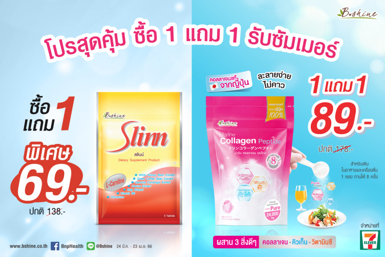 บริษัท บีไชน์ นูทริชั่น พลัส จำกัด ผู้จัดจำหน่ายอาหารเสริม เกรดพรีเมี่ยม ภายใต้แบรนด์ “บีไชน์” ที่ยึดมั่นผลิตสินค้าเพื่อสุขภาพที่ดีและปลอดภัยต่อผู้บริโภค มายาวนานกว่า 12 ปี ได้คิดค้นและพัฒนาสูตรหลากหลายผลิตภัณฑ์มาตลอด อยากให้คนไทยมีสุขภาพดีกับสินค้าที่มีคุณภาพ ปลอดภัย ราคาไม่แพง เพราะคิดเสมอว่าผู้บริโภคทุกคนคือคนในครอบครัวของบีไชน์ อยากให้ทุกคนมีสุขภาพดีและร่างกายแข็งแรง บีไชน์ได้จัดโปรโมชั่นสุดคุ้มรับซัมเมอร์ กับ 2 ผลิตภัณฑ์เพื่อคุณผู้หญิง ซึ่งคุณชายก็ทานได้ ผลิตภัณฑ์แรกคือ “บีไชน์ มารีน คอลลาเจน เปปไทด์” ช่วยบำรุงทั้งผิว ผม และกระดูก และ “สลินน์” เพื่อคนที่ดูแลตัวเองให้มีรูปร่างที่สมส่วน ส่วนผสมจากสารสกัดจากธรรมชาติ กับโปรโมชั่นสุดคุ้ม ซื้อ 1 ฟรี 1 หาซื้อได้ตั้งแต่วันนี้ - 23 เมษายน 2566 ที่ร้าน 7-Eleven ทั่วประเทศ