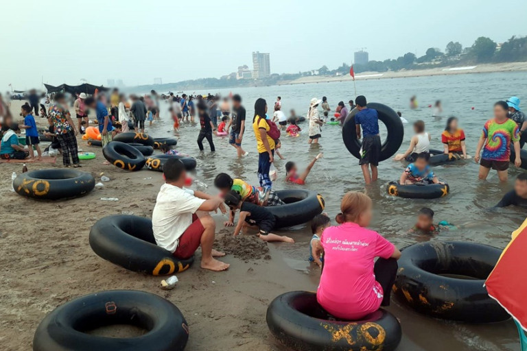 วันที่ 15 เม.ย.66 บรรยากาศการท่องเที่ยวเทศกาลมหาสงกรานต์อีสานหนองคาย มีนักท่องเที่ยวทั้งในพื้นที่ และจากต่างจังหวัด เดินทางไปเที่ยวตามสถานที่ท่องเที่ยวต่างๆ โดยเฉพาะทางน้ำคือหาดทรายริมแม่น้ำโขงของจังหวัดหนองคาย เพื่อคลายร้อน ท่ามกลางอากาศร้อนอบอ้าวติดต่อกันหลายวัน เช่นสถานที่ท่องเที่ยว บริเวณหาดทรายทอง บ้านหัวทราย หมู่ 11 ต.พานพร้าว อ.ศรีเชียงใหม่ และหาดท่ามะเฟือง หมู่ 6 ต.โพนสา อ.ท่าบ่อ จ.หนองคาย ซึ่งเป็นสถานที่ยอดฮิต ที่คนนิยมไปเล่นน้ำมากที่สุด ถือเป็นแหล่งท่องเที่ยวอันซีนไม่แพ้จากหาดทรายริมทะเล ซึ่งบริเวณหาดทรายริมแม่น้ำโขงยังได้จัดให้มีซุ้มอาหาร, ห้องอาบน้ำ,ห้องสุขา สถานที่จอดรถ ไว้บริการนักท่องเที่ยว โดยมีการรักษาความปลอดภัยทั้งทางบกและทางน้ำจากเจ้าหน้าที่อย่างเข้มข้นโดยเฉพาะ หาดทรายทองและหาดท่ามะเฟือง มีนักท่องเที่ยวแน่นชายหาด พร้อมกับสั่งอาหารมานั่งรับประทานริมน้ำโขงกับบรรยากาศที่แสนจะมีความสุข ทั้งสองหาดมีซุ้มอาหารไว้บริการนักท่องเที่ยวกว่า 200 ร้าน รวมถึงการบริการ ให้เช่าห่วงยางเล่นน้ำ อุปกรณ์เล่นน้ำ เจ็ตสกี บานาน่าโบ๊ท ครบวงจร ภายใต้การรักษาความปลอดภัยของเจ้าหน้าที่ ทั้งการเดินทางมาและการเดินทางกลับ