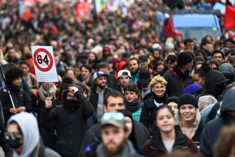 โดยภายหลังการประกาศคำวินิจฉัยของศาลรัฐธรรมนูญ ชาวฝรั่งเศสที่ไม่พอใจร่างกฎหมายดังกล่าวต่างออกมาชุมนุมประท้วงในหลายเมืองใหญ่ทั่วฝรั่งเศส ซึ่งการประท้วงในบางพื้นที่บานปลายกลายเป็นเหตุการณ์ความรุนแรง ผู้ประท้วงถือป้ายคัดค้าเกษียณอายุที่ 64 ปีที่เมืองน็องต์ ทางตะวันตกของฝรั่งเศส