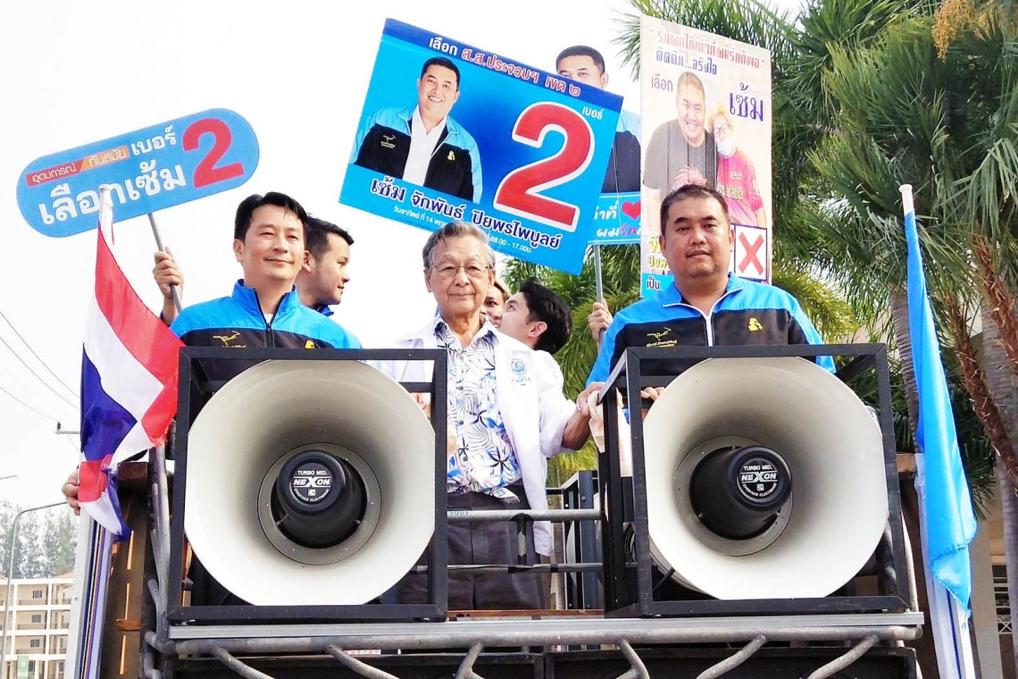 เมื่อเวลา 15.00 น. วันที่ 15 เม.ย.66 นายชวน หลีกภัย อดีตหัวหน้าพรรคประชาธิปัตย์ (ปชป.) ประธานที่ปรึกษาพรรคประชาธิปัตย์ ผู้สมัคร สส.บัญชีรายชื่อพรรค ลงพื้นที่บริเวณโรงพยาบาลสัตว์ มหาวิทยาลัยเกษตรศาสตร์ หัวหิน ต.หนองแก อ.หัวหิน จ.ประจวบคีรีขันธ์ เพื่อปราศรัยหาเสียงช่วยผู้สมัคร ส.ส.เขต 2 จ.ประจวบฯ นายจักพันธ์ ปิยพรไพบูลย์ หรือ ส.ส.เซ้ม อดีต ส.ส.บัญชีรายชื่อ หลานชาย นายเฉลิมชัย ศรีอ่อน เลขาธิการพรรค ปชป.