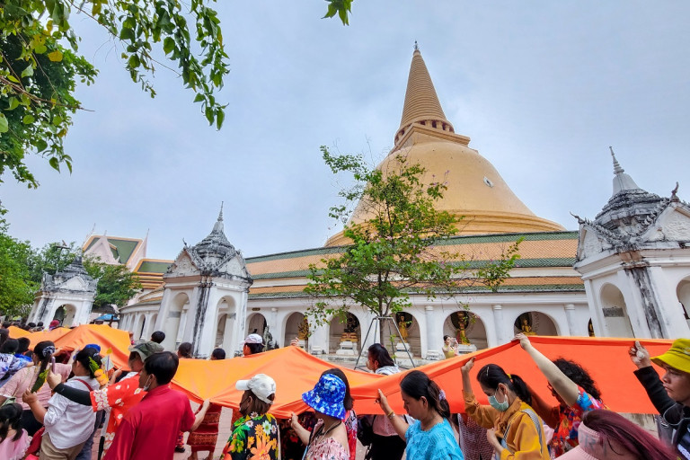 วันที่ 16 เมษายน 2566 ผู้สื่อข่าวรายงาน ว่า ที่บริเวณองค์พระปฐมเจดีย์ อำเภอเมือง จังหวัดนครปฐม มีกิจกรรมแห่ผ้าห่มองค์พระปฐมเจดีย์ ซึ่งมีชาวไทยและชาวเมียนมาร่วมกิจดังกล่าวเป็นจำนวนมาก โดยนาย กองเอก พงศธร ศิริสาคร รองผู้ว่าราชการจังหวัดนครปฐม และ นางณัฐจิรา ศิริสาคร รองนายกเหล่ากาชาดจังหวัดนครปฐม เป็นประธานถวายผ้าห่มองค์พระปฐมเจดีย์ พร้อมนำประชาชนร่วมสรงน้ำพระเทพมหาเจติยาจารย์ ที่ปรึกษาเจ้าคณะภาค 14 รองเจ้าอาวาสวัดพระปฐมเจดีย์ ราชวรมหาวิหาร และสรงน้ำพระสงฆ์ สามเณร เพื่อความเป็นสิริมงคลส่งท้ายเทศกาลสงกรานต์