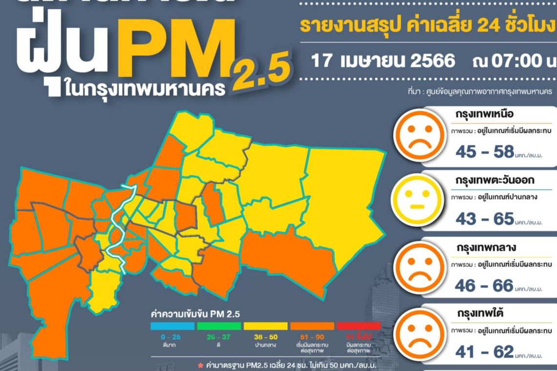 17 เม.ย.2566 ศูนย์ข้อมูลคุณภาพอากาศกรุงเทพมหานครขอสรุปผลการตรวจวัด PM2.5 วันที่ 17 เม.ย.2566 เวลา 05.00-07.00 น. (3 ชั่วโมงล่าสุด) ตรวจวัดได้ 40-71 มคก./ลบ.ม.โดยค่าเฉลี่ยของกรุงเทพมหานครอยู่ที่ 51.2 มคก./ลบ.ม.ทั้งนี้ค่า PM2.5 มีแนวโน้มลดลง แต่ยังคงเกินมาตรฐานอยู่ในระดับสีส้มเริ่มมีผลกระทบต่อสุขภาพบางพื้นที่