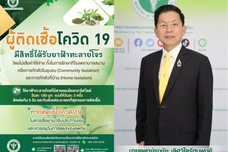 ด้าน นพ.เทวัญ ธานีรัตน์ รองอธิบดีกรมการแพทย์แผนไทยและการแพทย์ทางเลือก ได้กล่าวเพิ่มเติมกรณีการใช้ฟ้าทะลายโจรรักษาผู้ป่วยโควิด 19 โดยในปีที่ผ่านมา กรมฯ ได้นำแพทย์แผนไทยในส่วนกลางร่วมกับแพทย์แผนไทยส่วนภูมิภาคลงพื้นที่เพื่อดูแล รักษาผู้ป่วยโควิด 19 และ Long Covid 19 ทั่วประเทศ ส่วนกลาง พบผู้ป่วยเข้ารับการรักษาด้วยยาสมุนไพรกว่า 4,000 ราย เป็นผู้ป่วยกลุ่มเสี่ยง 2,428 ราย ผู้ป่วยระยะติดเชื้อ 310 ราย และผู้ป่วย Long COVID-19 1,332 ราย และในส่วนภูมิภาคดูแลประชาชนและผู้ป่วยกว่า 6,000 ราย เป็นกลุ่มเสี่ยง 2,541 ราย ผู้ป่วยระยะติดเชื้อ 1,183 ราย และ ผู้ป่วย Long COVID-19 2,383 ราย และในปี พ.ศ. 2566 กรมฯ ยังคงมีความห่วงใยประชาชน จึงส่งแพทย์แผนไทยในส่วนกลาง เข้าไปร่วมกับแพทย์แผนไทย และสหวิชาชีพในส่วนภูมิภาค เพื่อดำเนินการขับเคลื่อนการรักษาผู้ป่วยโควิด 19 และ ผู้ป่วย Long COVID 19 ทั่วประเทศ โดยเริ่มลงพื้นที่ จ.แพร่ และมีแผนลงพื้นที่ดูแลประชาชน ที่ จ.อุบลราชธานี อุทัยธานี ตราด นราธิวาส อย่างต่อเนื่อง ด้านการใช้เทคโนโลยีทางการสื่อสารเพื่อให้ประชาชนเข้าถึงข้อมูลการใช้สมุนไพรฟ้าทะลายโจร กรมการแพทย์แผนไทยและการแพทย์ทางเลือก จัดทำช่องทาง ให้คำปรึกษาเกี่ยวกับยาฟ้าทะลายโจรรวมถึงการใช้ยาสมุนไพร แนะนำอาหารเป็นยา และการดูแลรักษาอาการ โควิด 19 เบื้องต้น โดยแพทย์แผนไทย ผ่าน Line Official Account (Line OA) @morthai-covid หมอแผนไทยสู้ภัยโควิด , @fahdtam “FahFirstAid” และ Line @DTAM