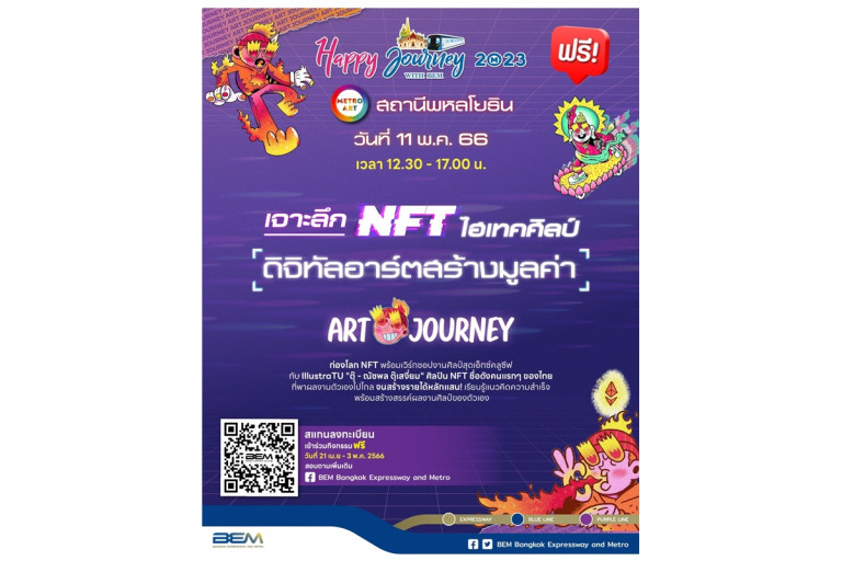 บริษัท ทางด่วนและรถไฟฟ้ากรุงเทพ จำกัด (มหาชน) (BEM) ผู้ให้บริการทางพิเศษและรถไฟฟ้า MRT สายสีน้ำเงินและสายสีม่วง ชวนเหล่าสายอาร์ตยุคดิจิตอลร่วมท้าทายประสบการณ์งานศิลป์ “เจาะลึก NFT ไฮเทคศิลป์ ดิจิทัลอาร์ตสร้างมูลค่า” กับกิจกรรม Art Journey ภายใต้โครงการ Happy Journey with BEM กิจกรรม Workshop ที่จะพาทุกคนท่องโลก NFT กับ lllustraTU อิลัสเตรตุ๊ “ตุ๊ – ณัชพล ตุ๊เสงี่ยม” ศิลปิน NFT ชื่อดังคนแรกๆของไทย ที่พาผลงานตัวเองไปไกล มีผลงานโดดเด่นและน่าสนใจในสนาม NFT แพลตฟอร์ม สามารถสร้างมูลค่าและรายได้หลักแสน ด้วยผลงานที่มีเอกลักษณ์ใช้สีสันฉูดฉาดอันทรงพลัง พร้อมแชร์ประสบการณ์ แรงบันดาลใจการก้าวเข้าสู่วงการ NFT ถ่ายทอดแนวคิดความสำเร็จ กันแบบฟรีๆไม่มีค่าใช้จ่าย ในวันที่ 11 พฤษภาคม 2566 ณ MRT สถานีพหลโยธิน