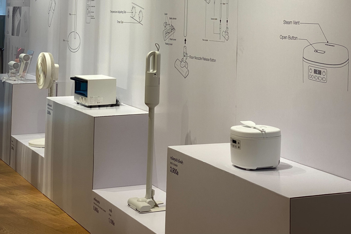 ภายในนิทรรศการ “MUJI Home Appliances” มีการจัดแสดงผลิตภัณฑ์ใหม่ทั้งหมด 5 ชนิด ในกลุ่มเครื่องใช้ไฟฟ้าในบ้าน Home Appliances ประกอบด้วย หม้อหุงข้าว เตาอบ เครื่องดูดฝุ่น พัดลมตั้งพื้น และไดร์เป่าผม ในรูปแบบของบอร์ดนิทรรศการภาพบรรยาย ผสานรูปแบบอินสตอลเลชัน (Installation) เพื่อต้องการแสดงโชว์เคสของเครื่องใช้ไฟฟ้าแต่ละชนิด ในรูปแบบของงานศิลปะที่ทำให้ลูกค้า หรือแฟน MUJI ที่มาร่วมนิทรรศการได้สัมผัสใกล้ชิด และเห็นถึงความโดดเด่นของงานดีไซน์ในแต่ละผลิตภัณฑ์ที่มีความลงตัว และกลืมกลืนไปการใช้งานในชีวิตประจำวันของแต่ละพื้นที่ภายในบริเวณที่อยู่อาศัย ด้วยดีไซน์ที่คลุมโทนแบบมินิมัล เรียบง่าย แต่ลงตัว โดดเด่นด้วยพื้นผิวภายนอกที่ใช้โทนสีขาวทั้งหมดกับทุกไอเท็ม