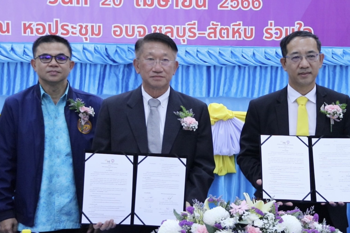 ที่หอประชุม อบจ.ชลบุรี-สัตหีบ ร่วมใจ อ.สัตหีบ จ.ชลบุรี นายปิยะ รัชตวรคุณ ผู้จัดการฝ่ายประจำรักษาการผู้ช่วยกรรมการผู้จัดการใหญ่กลุ่มขายและปฏิบัติการลูกค้าภาคตะวันออก บริษัท โทรคมนาคมแห่งชาติ (จำกัด) มหาชน พร้อมด้วย นายณรงค์ บุญบรรเจิดศรี นายกเทศมนตรีเมืองสัตหีบ ร่วมลงนามในบันทึกข้อตกลงความร่วมมือการพัฒนาเมืองอัจฉริยะ ระหว่าง บริษัท โทรคมนาคมแห่งชาติ(จำกัด) มหาชน หรือ NT กับเทศบาลเมืองสัตหีบ โดยมีนายสุนทร มูเนาวาเราะ นายอำเภอสัตหีบ พร้อมด้วย ดร.ธัชพล กาญจนกุล รองเลขาธิการคณะกรรมการนโยบายเขตพัฒนาพิเศษภาคตะวันออก และแขกผู้มีเกียรติ ร่วมเป็นสักขีพยาน ในการลงนาม MOU ความร่วมมือในครั้งนี้
