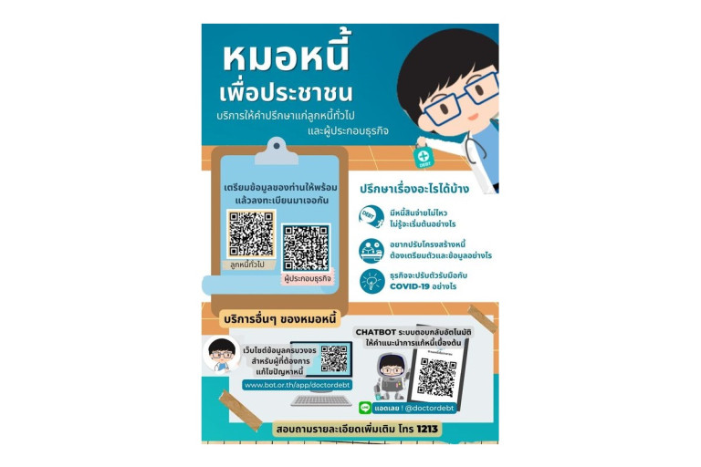 ธนาคารแห่งประเทศไทยเผยว่า "หมอหนี้เพื่อประชาชน" แหล่งรวมข้อมูลครบวงจรสำหรับผู้ที่ต้องการความรู้เรื่องหนี้ คำแนะนำการแก้หนี้ และบริการให้คำปรึกษาเชิงลึกสำหรับประชาชนและผู้ประกอบธุรกิจ เพื่อแก้ไขปัญหาหนี้สินโดยผู้เชี่ยวชาญทางการเงิน ผู้สนใจสามารถศึกษาข้อมูลด้วยตนเอง และลงทะเบียนขอรับคำปรึกษาผ่านช่องทางต่างๆดังนี้