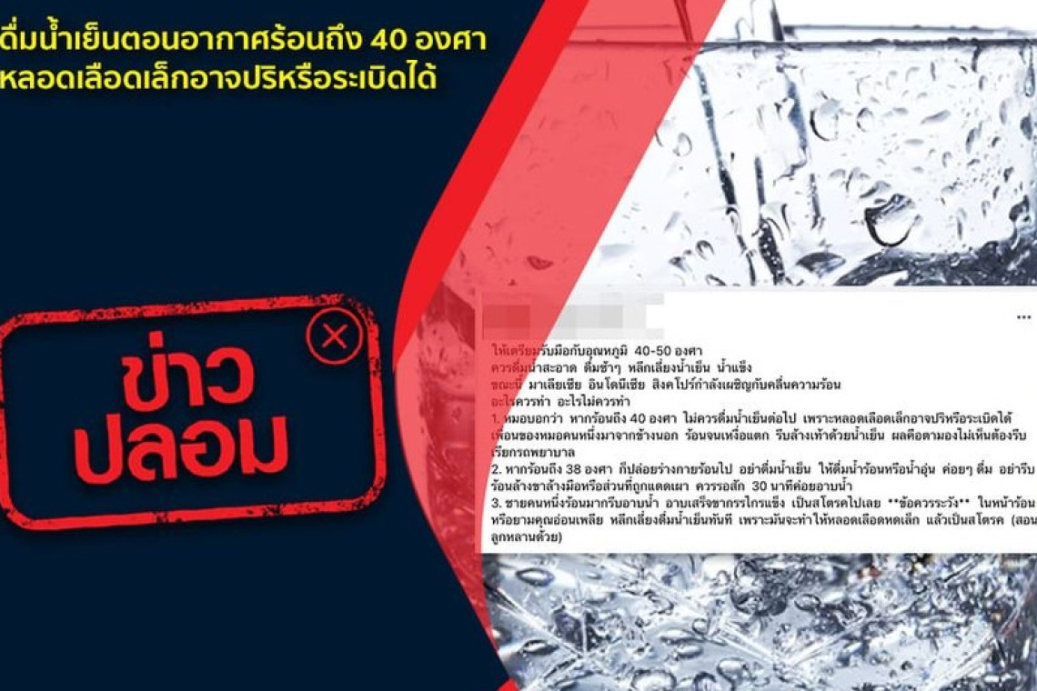 ตามที่มีการส่งต่อคำแนะนำถึงเรื่องดื่มน้ำเย็นตอนอากาศร้อนถึง 40 องศา หลอดเลือดเล็กอาจปริหรือระเบิดได้ ทางศูนย์ต่อต้านข่าวปลอมได้ดำเนินการตรวจสอบข้อเท็จจริงโดยโรงพยาบาลราชวิถี กรมการแพทย์ กระทรวงสาธารณสุข พบว่าประเด็นดังกล่าวนั้น เป็นข้อมูลเท็จ