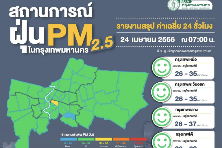 ศูนย์ข้อมูลคุณภาพอากาศกรุงเทพมหานครรายงานสถานการณ์ฝุ่นละอองขนาดไม่เกิน 2.5 ไมครอน (PM 2.5) ของสถานีตรวจวัดคุณภาพอากาศของกรุงเทพมหานคร ประจำวันจันทร์ที่ 24 เมษายน พ.ศ. 2566 เวลา 07.00 น. ค่าเฉลี่ย 24 ชั่วโมง ของฝุ่นละอองขนาดไม่เกิน 2.5 ไมครอน (PM2.5) ตรวจวัดได้ 21-38 ไมโครกรัม/ลูกบาศก์เมตร(มคก./ลบ.ม.) พบว่าไม่เกินมาตรฐานทุกพื้นที่ที่มีการตรวจวัด (มาตรฐานไม่เกิน 50 มคก./ลบ.ม.) ดัชนีคุณภาพอากาศของสถานีตรวจวัดของกรุงเทพมหานคร ส่วนใหญ่อยู่ในระดับคุณภาพอากาศดี