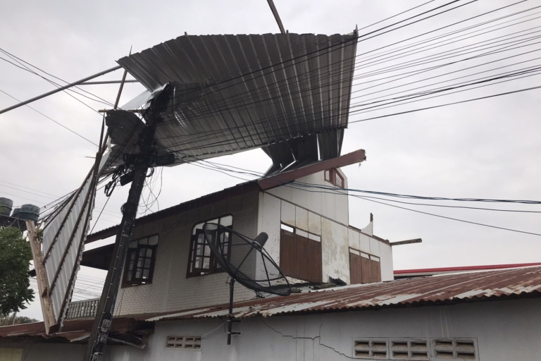 บ้านพักนายสมหวัง โฮมแพน เลขที่ 45 หมู่ที่ 3 สันไทมุงหลังคาเปิดออกทั้งหลังไปเกาะติดอยู่ที่ปลายเสาไฟฟ้าแรงต่ำ เสียหาย ไม่น้อยกว่า10,000บาท