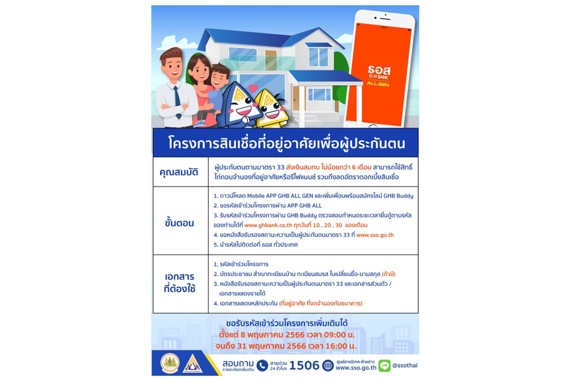 นายบุญชอบ สุทธมนัสวงษ์ ปลัดกระทรวงแรงงาน เปิดเผยผลการดำเนิน “โครงการสินเชื่อที่อยู่อาศัยเพื่อผู้ประกันตน”ว่า เป็นที่น่าพอใจ ผู้ประกันตนมาตรา 33 ยื่นขอสินเชื่อแล้ว 18,815 ล้านบาท ล่าสุด สำนักงานประกันสังคม ได้ร่วมกับธนาคารอาคารสงเคราะห์ เปิดโอกาสให้ผู้ประกันตน ที่สนใจขอรับรหัส เข้าร่วมโครงการสินเชื่อที่อยู่อาศัยเพื่อผู้ประกันตนเพิ่มเติมได้แล้ว ผ่าน Application : GHB ALL GEN ตั้งแต่วันที่ 8 พฤษภาคม 2566 ที่จะถึงนี้ เวลา 9.00 น. เป็นต้นไป ถึง 31 พฤษภาคม 2566 เวลา 16.00 น. พร้อมขอรับหนังสือรับรองสถานะความเป็นผู้ประกันตนแบบอิเล็กทรอนิกส์ได้ที่ www.sso.go.th ของสำนักงานประกันสังคม เพื่อประกอบการยื่นกู้กับธนาคารอาคารสงเคราะห์ และสามารถทำนิติกรรมภายในวันที่ 31 มกราคม 2567