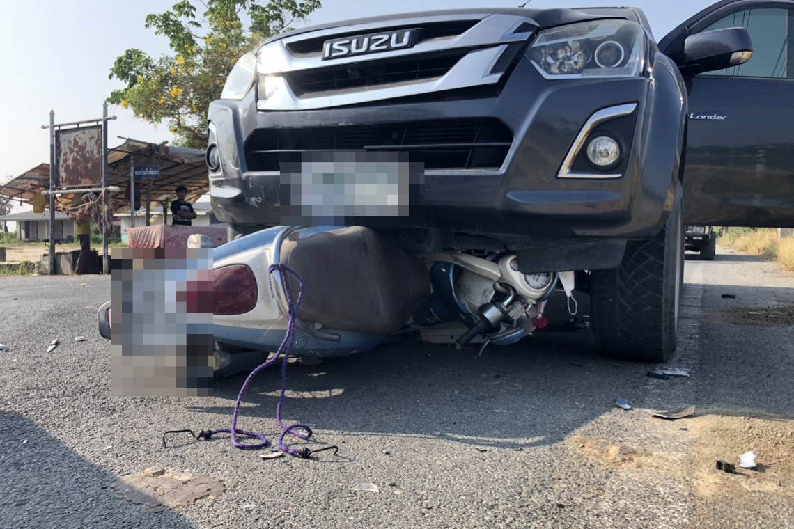 ที่เกิดเหตุพบรถยนต์กระบะยี่ห้ออีซูซุสีเทาดำ ทะเบียน 2950 กรุงเทพมหานคร จอดทับรถจักรยานยนต์ยี่ห้อฮอนด้าฟีโน่สีฟ้าขาวทะเบียน 1กช 8485 สุพรรณบุรี ครึ่งคัน ที่บริเวณหน้ารถห่างกันประมาณ 3 เมตรพบร่างผู้เสียชีวิตทราบชื่อนายธานี เพ็งพันธ์ อายุ 72 ปี บ้านอยู่ตำบลทะเลบก อำเภอดอนเจดีย์ นุ่งกางเกงขาสั้นสวมเสื้อเชิ๊ตลายสก๊อตทับกัน 2 ตัวนอนคว่ำเสียชีวิตที่เกิดเหตุ ตรวจสอบเบื้องต้นพบมีแผลถลอกที่ใบหน้าและที่ขาทั้งสองข้างในที่เกิดเหตุยังพบตะกร้าใส่มะม่วงตกอยู่มีมะม่วงกระจายเกลื่อน