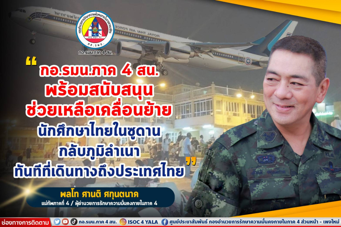 แม่ทัพภาคที่ 4 ยันรัฐบาล กองทัพ พร้อมช่วยเหลือนักศึกษาคนไทยในซูดานอย่างเต็มศักยภาพพร้อมกลับสู่มาตุภูมิ