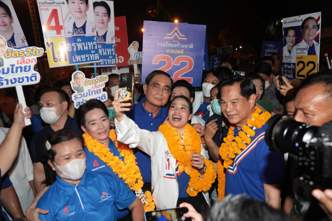 เมื่อเวลา 18.30 น. วันที่ 26 เม.ย. 66 ที่ศูนย์เยาวชนกรุงเทพมหานคร ไทย-ญี่ปุ่น พล.อ.ประยุทธ์ จันทร์โอชา ในฐานะประธานคณะกรรมการกำหนดแนวทางและยุทธศาสตร์พรรครวมไทยสร้างชาติ (รทสช.) พร้อมด้วย นายพีระพันธุ์ สาลีรัฐวิภาค หัวหน้าพรรค นายเอกนัฏ พร้อมพันธุ์ เลขาธิการพรรค ร่วมลงพื้นที่หาเสียงเพื่อขอคะแนนคนกรุงสนับสนุนน.ส.อรพินทร์ เพชรทัต ผู้สมัคร ส.ส.กทม. เขต 6 พญาไท ดินแดง เบอร์ 4 และ น.ส.ภรณี วัฒนโชติ ผู้สมัคร ส.ส.กทม. เขต 5 ห้วยขวาง วังทองหลาง (ยกเว้นแขวงคลองเจ้าคุณสิงห์) เบอร์ 11 ท่ามกลางประชาชนที่มาออกกำลังกายและรอต้อนรับตลอดเส้นทางที่เดินพบปะ โดยบรรยากาศเป็นไปอย่างคึกคัก