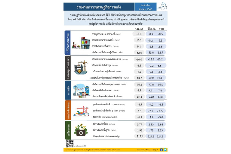 นายพรชัย ฐีระเวช ผู้อำนวยการสำนักงานเศรษฐกิจการคลัง เปิดเผยภาวะเศรษฐกิจการคลังประจำเดือนมีนาคม 2566 ว่า “เศรษฐกิจไทยในเดือนมีนาคม 2566 ได้รับปัจจัยสนับสนุนจากการท่องเที่ยวและภาคการเกษตรที่ขยายตัวได้ดี อัตราเงินเฟ้อที่ลดลงต่อเนื่อง อย่างไรก็ดี มูลค่าการส่งออกสินค้าในรูปเงินสกุลดอลลาร์สหรัฐยังคงหดตัว แต่ในอัตราที่ลดลงจากเดือนก่อนหน้า” โดยมีรายละเอียดสรุปได้ ดังนี้