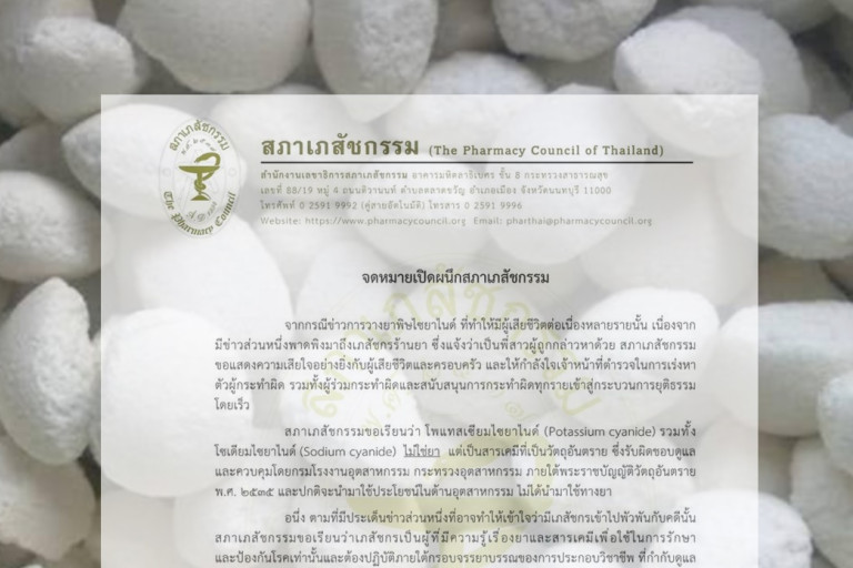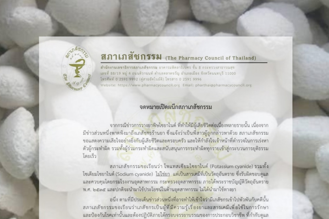 สภาเภสัชกรรมขอเรียนว่า "โปตัสเซียมไซยาไนด์" รวมทั้ง "โซเดียมไซยาไนด์" ไม่ใช่ยา !