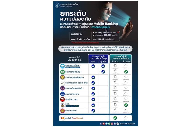 ทั้งนี้สามารถอัพเดตข้อมูลใบหน้าเพื่อเตรียมความพร้อมที่สาขาใดก็ได้ หรือช่องทางตามที่ธนาคารกำหนดภายใน มิ.ย.66 เพื่อให้สามารถทำธุรกรรมได้ไม่สะดุด