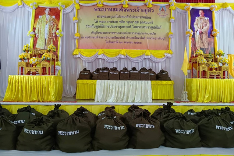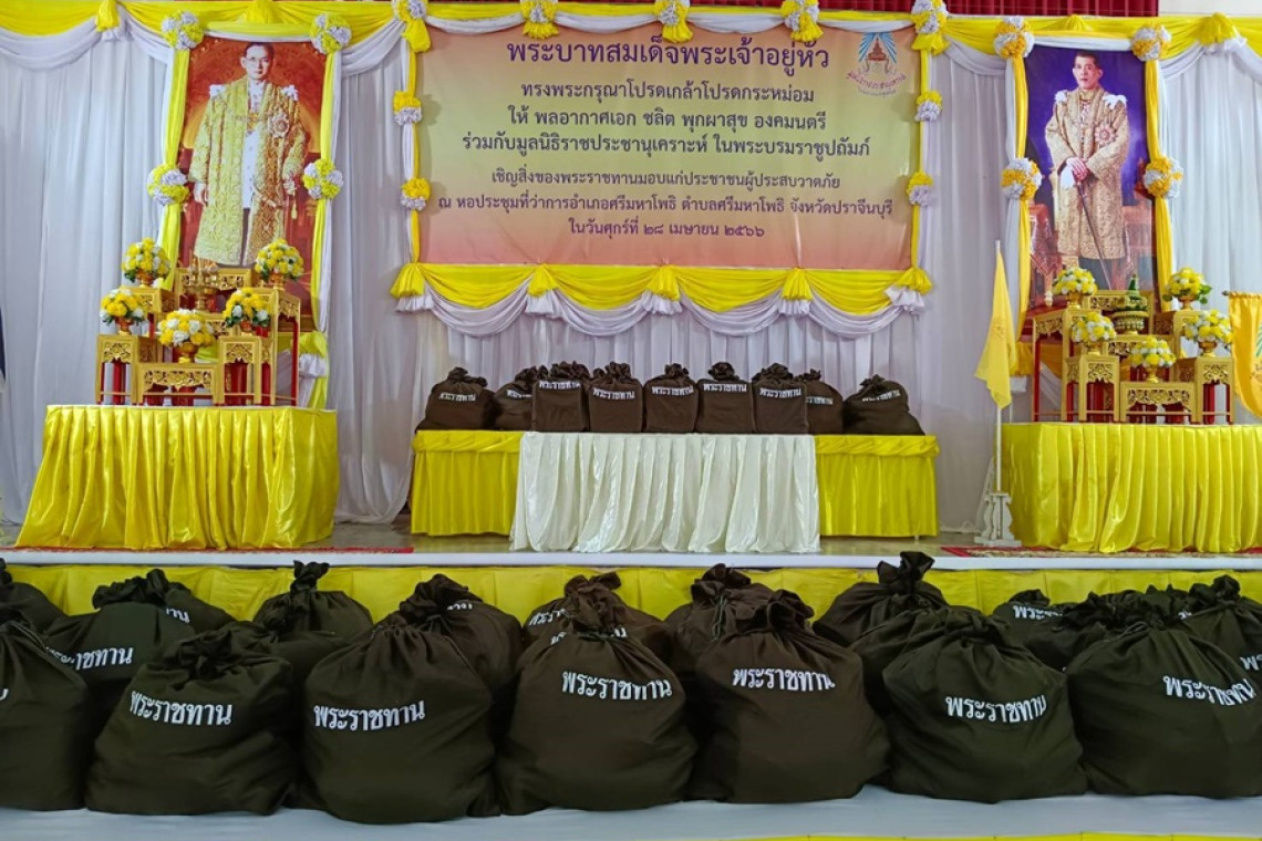 พระบาทสมเด็จพระเจ้าอยู่หัว ทรงพระกรุณาโปรดเกล้าโปรดกระหม่อมให้องคมนตรี เชิญถุงพระราชทานและเครื่องอุปโภคบริโภคไปมอบแก่ราษฎรที่ประสบวาตภัยในพื้นที่จังหวัดปราจีนบุรี ณ หอประชุมที่ว่าการอำเภอศรีมหาโพธิ จังหวัดปราจีนบุรี วันที่ 28 เมษายน 2566