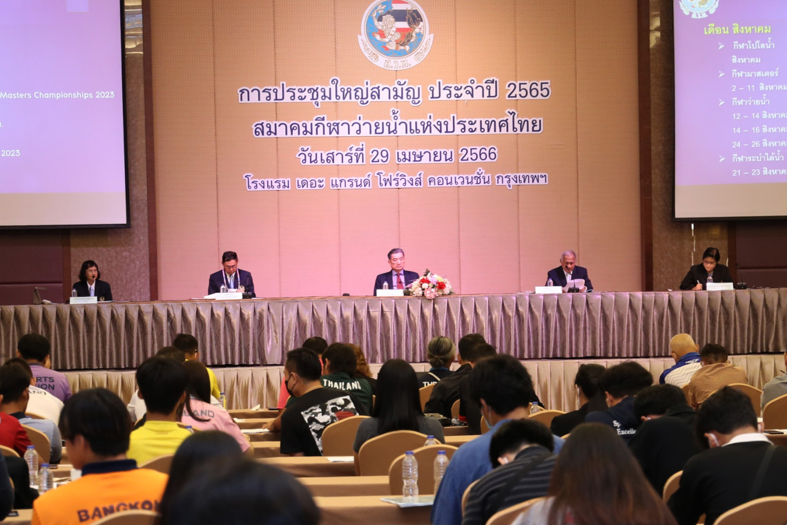 วันที่ 29 เมษายน 2566 เวลา โรงแรม เดอะแกรนด์โฟร์วิงส์ คอนเวนชั่น ถนนศรีนครินทร์ กรุงเทพฯ สมาคมกีฬาว่ายน้ำแห่งประเทศไทย ได้จัดการประชุมใหญ่สามัญ ประจำปี 2565 โดยในการประชุม พล.อ. ประวิตร วงษ์สุวรรณ นายกสมาคมฯ มอบหมายให้ พล.อ. ศิริชัย ดิษฐกุล อุปนายก เป็นประธานในการประชุม พร้อมด้วยคณะกรรมการบริหารสมาคมฯ ผู้แทนจากการกีฬาแห่งประเทศไทย และสโมสรสมาชิก จำนวน 169 สโมสร ซึ่งมีผู้เข้าร่วมประชุมทั้งหมด 195 คน
