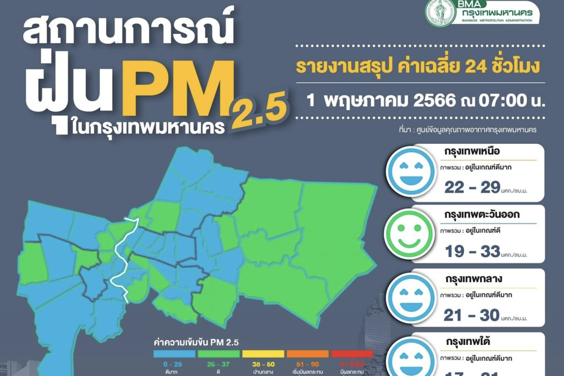 ศูนย์ข้อมูลคุณภาพอากาศกรุงเทพมหานครรายงานสถานการณ์ฝุ่นละอองขนาดไม่เกิน 2.5 ไมครอน (PM 2.5) ของสถานีตรวจวัดคุณภาพอากาศของกรุงเทพมหานคร ประจำวันจันทร์ที่ 1 พฤษภาคม พ.ศ. 2566 เวลา 07.00 น. ค่าเฉลี่ย 24 ชั่วโมง ของฝุ่นละอองขนาดไม่เกิน 2.5 ไมครอน (PM2.5) ตรวจวัดได้ 15-33 ไมโครกรัม/ลูกบาศก์เมตร(มคก./ลบ.ม.) พบว่าไม่เกินมาตรฐานทุกพื้นที่ที่มีการตรวจวัด (มาตรฐานไม่เกิน 50 มคก./ลบ.ม.) ดัชนีคุณภาพอากาศของสถานีตรวจวัดของกรุงเทพมหานคร ส่วนใหญ่อยู่ในระดับคุณภาพอากาศดีมาก