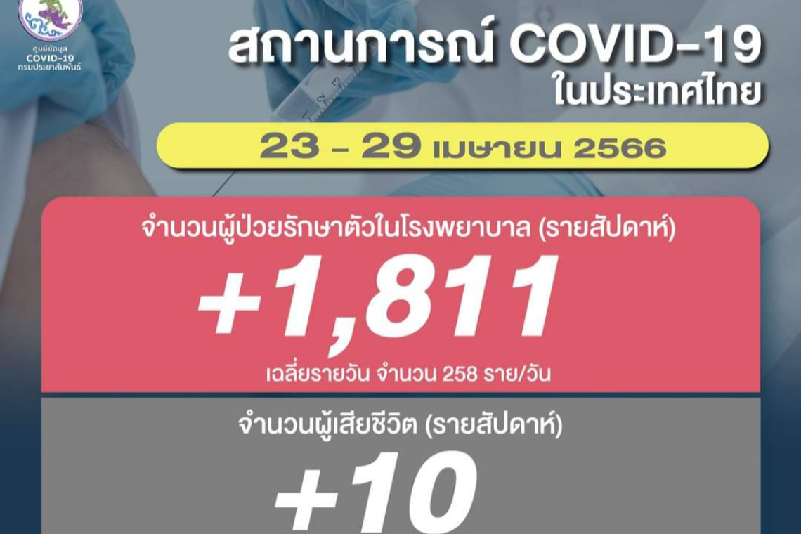วันที่ 1 พ.ค.2566 ศูนย์ข้อมูล COVID-19 กรมประชาสัมพันธ์ รายงานสถานการณ์โรคโควิด-19 รายสัปดาห์ เกาะติดยอดผู้ติดเชื้อโควิด-19 รายสัปดาห์ ระหว่างวันที่ 23 - 29 เมษายน 2566 พบผู้ป่วยรักษาตัวในโรงพยาบาล (รายสัปดาห์) จำนวน 1,811 ราย : เฉลี่ยรายวัน จำนวน 258 ราย/วัน ผู้เสียชีวิต (รายสัปดาห์) จำนวน 10 ราย : เฉลี่ยรายวัน จำนวน 1 ราย/วัน ทั้งนี้พบยอดป่วยสะสม 8,382 ราย (ตั้งแต่ 1 มกราคม 2566)เสียชีวิตสะสม 288 ราย (ตั้งแต่ 1 มกราคม 2566)