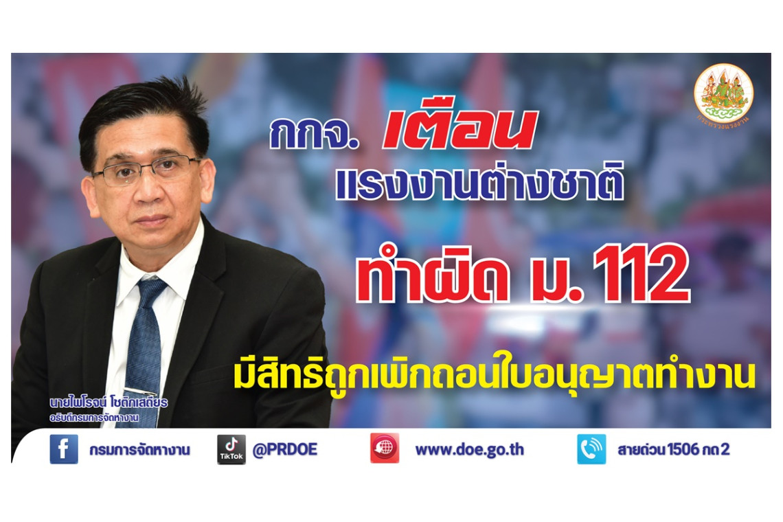 กรมการจัดหางาน เตือนแรงงานต่างชาติ ทำผิด ม. 112 มีสิทธิถูกเพิกถอนใบอนุญาตทำงาน