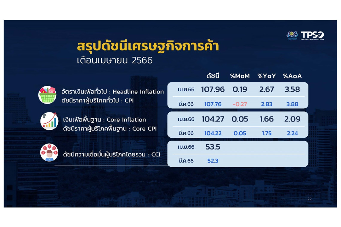 ส่วนเงินเฟ้อพื้นฐาน เมื่อหักอาหารสดและพลังงานออก สูงขึ้นร้อยละ 1.66 (YoY) ชะลอตัวต่อเนื่องจากเดือนมีนาคม 2566 ที่สูงขึ้นร้อยละ 1.75 (YoY) สำหรับดัชนีราคาผู้บริโภคในเดือนนี้ เมื่อเทียบกับเดือนก่อนหน้า สูงขึ้นเล็กน้อยร้อยละ 0.19 (MoM) และเฉลี่ย 4 เดือนแรก (ม.ค. – เม.ย.) ปี 2566 เทียบกับช่วงเดียวกันของปีก่อน สูงขึ้นร้อยละ 3.58 (AoA) เมื่อพิจารณาเงินเฟ้อของไทยเทียบกับต่างประเทศ (ข้อมูลล่าสุดเดือนมีนาคม 2566) พบว่า เงินเฟ้อไทยต่ำเป็นอันดับที่ 14 จาก 133 เขตเศรษฐกิจที่มีการประกาศตัวเลข ซึ่งถือว่าอยู่ในระดับที่ดีกว่าหลายเขตเศรษฐกิจ อาทิ สหรัฐอเมริกา อิตาลี สหราชอาณาจักร เม็กซิโก อินเดีย ญี่ปุ่น และเกาหลีใต้ และอยู่ระดับต่ำที่สุดในอาเซียน จาก 7 ประเทศที่ประกาศตัวเลข ทั้ง สปป.ลาว ฟิลิปปินส์ สิงคโปร์ อินโดนีเซีย มาเลเซีย และเวียดนาม