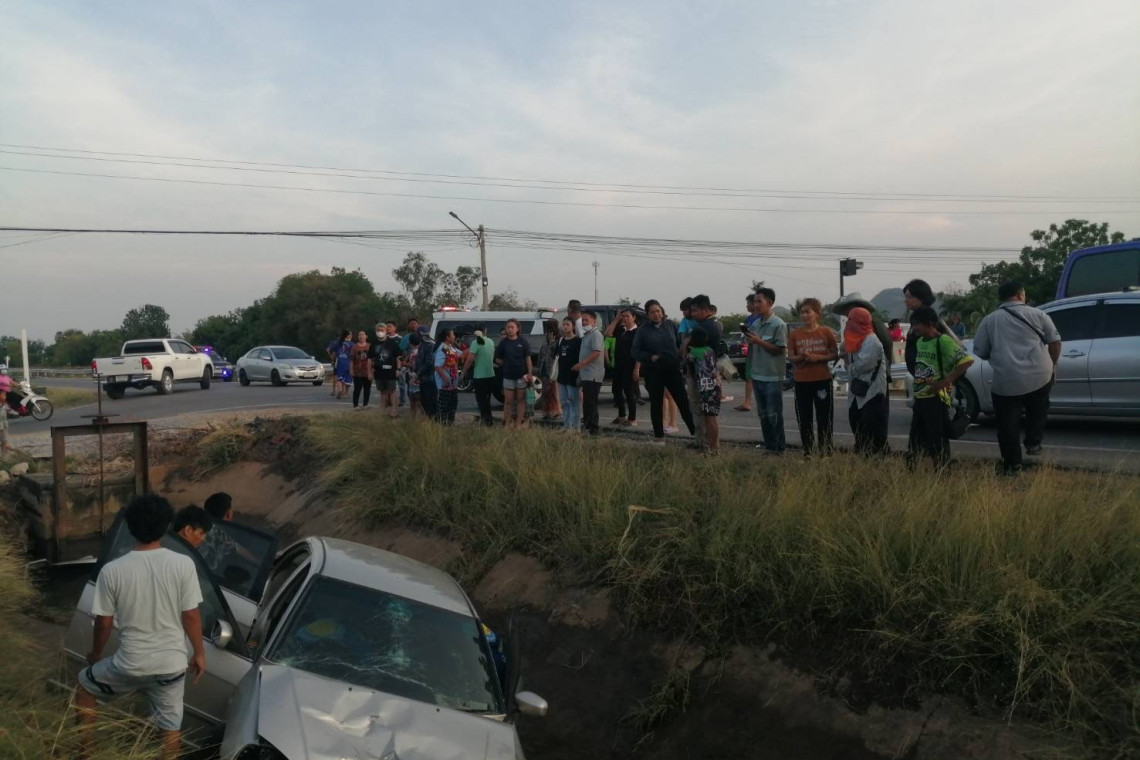 ส่วนรถยนต์เก๋งเสียหลักพุ่งตกลงหัวทิ่มไปในคลองซอยที่มีน้ำเล็กน้อย เบื้องต้นจากการสอบสวนทราบว่า รถยนต์เก๋งวิ่งมุ่งหน้ามาตามถนนเพื่อจะเดินทางกลับบ้านที่ อ.ไทรโยค พอมาถึงที่เกิดเหตุซึ่งเป็นถนน 3 แยกข้ามคลองชลประทานขนาดใหญ่ข้ามฝั่งไปทางหมู่บ้านหัวเขาแรด จึงเกิดชนกันอย่างจังเป็นผลให้รถยนต์เก๋งเสียหลักพุ่งตกลงไปในคลองซอยขนาดเล็กที่มีน้ำนิดหน่อย เดชะบุญที่รถทั้ง 2 คันไม่ได้เสียหลักตกลงไปในคลองใหญ่ ซึ่งมีน้ำเต็มฝั่ง จึงมีแต่ผู้ได้รับบาดเจ็บ ไม่มีผู้เสียชีวิต ซึ่งเจ้าหน้าที่ตำรวจจะได้ติดตามสอบสวนปากคำผู้ได้รับบาดเจ็บ เพื่อหาสาเหตุของการเกิดอุบัติเหตุครั้งนี้ เพื่อดำเนินการตามกฎหมายต่อไป