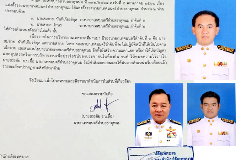 ทั้งนี้ นายสรรชัย ธ.น.ตื้อ หรือนายกเป้ นายกเทศมนตรีเทศบาลตำบลธาตุพนม เปิดเผยว่า ในการลงนามคำสั่งปลดรองนายกเทศมนตรีทั้ง 2 คน ยืนยันไม่ได้เกี่ยวจากปัญหาความขัดแย้ง ความเห็นต่างทางการเมือง หรือการสนับสนุนพรรคการเมืองใหญ่ ในการเลือกตั้ง เพราะให้ความอิสระในความเห็นต่าง ของแต่ละคน แต่ปัญหาหลักคือเรื่องไม่สนองนโยบายการพัฒนา รวมถึงการสร้างความแตกแยกในองค์กร จนขัดต่อการพัฒนาท้องถิ่น ไม่สามารถเดินหน้าได้ จึงต้องมีการตัดปัญหาเพื่อหาทางออก ให้การพัฒนาท้องถิ่นเดินไปข้างหน้า ส่วนการเลือกตั้งผู้แทน เป็นสิทธิของแต่ละคนที่จะสนับสนุนพรรคการเมือง และสามารถทำได้ ภายใต้กรอบกฎหมาย อย่างไรก็ตามในการตั้งบุคคลมาดำรงตำแหน่งแทน จะต้องรอพิจารณาต่อไป เชื่อว่าหากตัดปัญหาความขัดแย้งออกไปจะสามารถพัฒนาท้องถิ่น ทั้ง 15 ชุมชน ให้ประชาชาชน ได้รับการพัฒนาที่ทั่วถึงมากกว่านี้