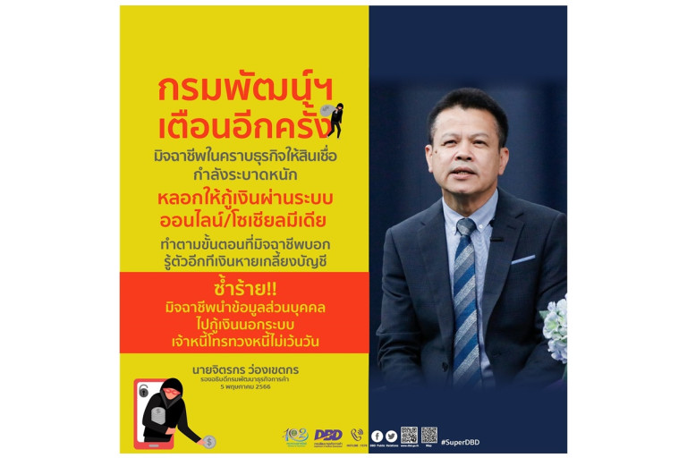 กรมพัฒนาธุรกิจการค้า เตือนประชาชนที่จะกู้เงินออนไลน์ต้องระมัดระวังเป็นพิเศษ หลังได้รับการร้องเรียนว่า ธุรกิจสินเชื่อให้กู้เงินผ่านช่องทางออนไลน์/โซเชียลมีเดีย ดูดเงินในบัญชีจนเกลี้ยง หลังทำตามขั้นตอนที่มิจฉาชีพบอก ก่อนหน้าเห็นใบสำคัญการจดทะเบียนนิติบุคคลและใบทะเบียนพาณิชย์ทำให้เกิดความเชื่อถือ หลังโดนดูดเงิน..ตรวจเช็คเชิงลึกพบเป็นใบสำคัญฯ และใบทะเบียนพาณิชย์ปลอม ช้ำใจเพิ่มขึ้น มิจฉาชีพนำข้อมูลส่วนบุคคลไปกู้เงินนอกระบบ เจ้าหนี้โทรทวงหนี้ไม่เว้นวัน ย้ำหลายๆ รอบ ประชาชนต้องรู้ทันกลโกงมิจฉาชีพออนไลน์ทุกรูปแบบ ย้ำจะกู้เงินควรขอสินเชื่อจากสถาบันที่น่าเชื่อถือและได้รับอนุญาตจากหน่วยงานที่เกี่ยวข้อง สำคัญสุดต้องไม่ให้ข้อมูลส่วนตัว หรือถ่ายภาพบัตรประจำตัวประชาชนให้กับใคร มิฉะนั้นจะเสียใจและเสียหายหนักมาก