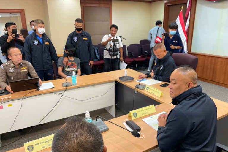 สอท., พล.ต.ต.อำนาจ ไตรพจน์ พล.ต.ต.ไพโรจน์ สุขรวยธนโชติ รอง ผบช.สอท. , พล.ต.ต.ชัชปัณฑกาณฑ์ คล้ายคลึง ผบก.สอท.1 , พ.ต.อ.กฤษณะ พัฒนเจริญ โฆษกบช.สอท. , พ.ต.อ.พิเชียรยศ อรุณพันธกุล ผกก.1 บก.สอท.3 ร่วมกันแถลงข่าวการจับกุมผู้ต้องหาคอลเซ็นเตอร์ อ้างตัวเป็นเจ้าหน้าที่พัสดุตุ๋นเหยื่อโอนเงินสูญ 42 ล้าน